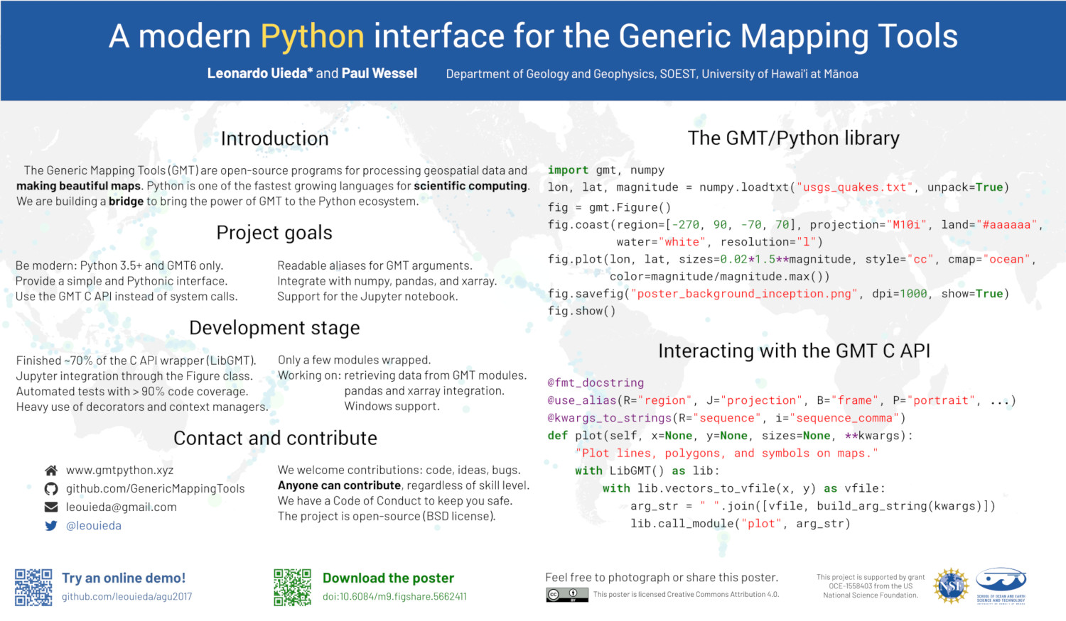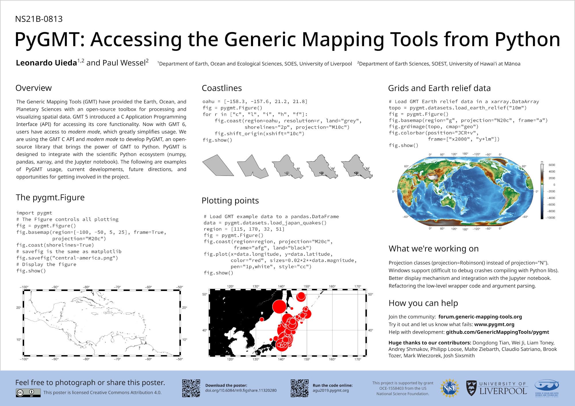 “PyGMT: Accessing the Generic Mapping Tools from Python”. 2019. Leonardo Uieda and Paul Wessel. Presented at AGU 2019. doi:10.6084/m9.figshare.11320280